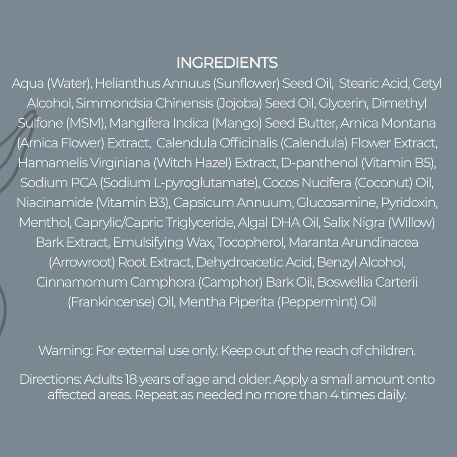 All Ingredients: Aqua (Water), Helianthus Annuus (Sunflower) Seed Oil, Stearic Acid, Cety Alcohol, Simmondsia Chinensis (Jojoba) Seed Oil, Glycerin, Dimethyl Sulfone (MSM), Mangifera Indica (Mango) Seed Butter, Arica Montana (Arnica Flower) Extract, Calendula Officinalis (Calendula) Flower Extract Hamamelis Virginiana (Witch Hazel) Extract, D panthenol (Vitamin B5), Sodium PCA (Sodium L-pyroglutamate), Cocos Nucifera (Coconut) Oil, Niacinamide (Vitamin B3), Capsicum Annuum, Glucosamine, Pyridoxin, Menthol, Caprylic/Capric Triglyceride, Algal DHA Oil, Salix Nigra (Willow) Bark Extract, Emulsifying Wax, Tocopherol, Maranta Arundinacea (Arrowroot) Root Extract, Dehydroacetic Acid, Benzyl Alcohol, Cinnamomum Camphora (Camphor) Bark Oil, Boswellia Carteri (Frankincense) Oi, Mentha Piperita (Peppermint) Oil