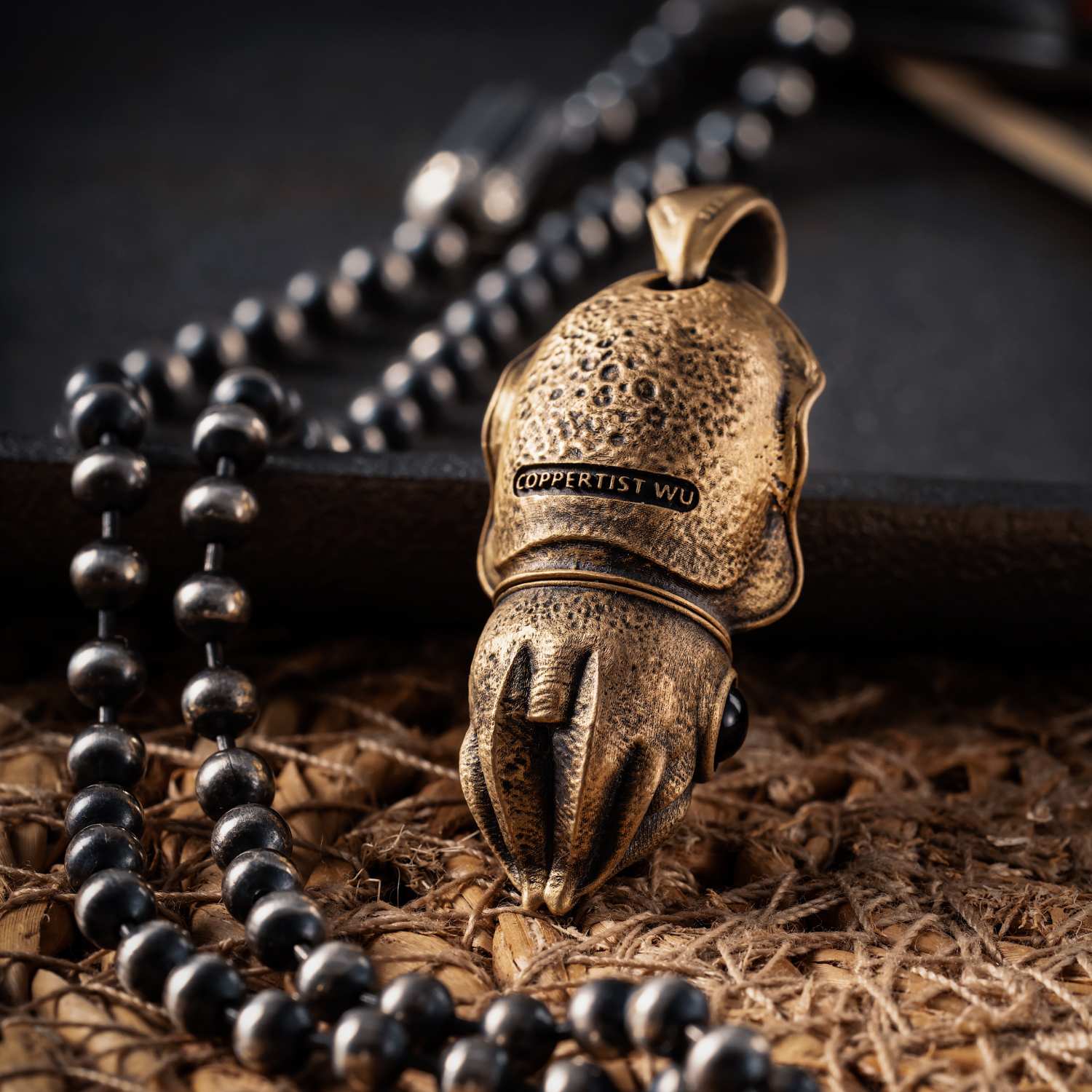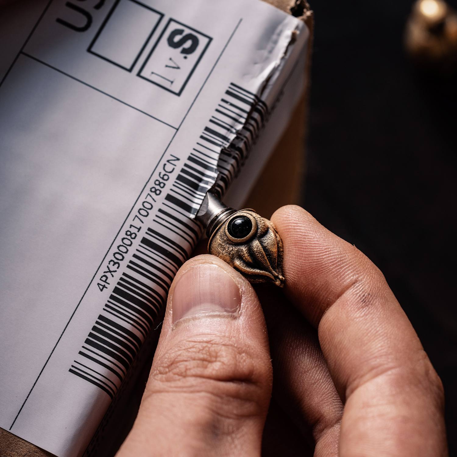 Crafting this pendant involves intricate details, especially in inlaying CNC-cut titanium alloy into cast products—a process demanding high precision. The pendant is 3D wax sprayed directly for casting, ensuring a perfect fit between the box opener and the cuttlefish body. The absence of molds in casting enhances precision, with clearly visible textures on the back of the cuttlefish. To add a lifelike touch, the cuttlefish's eyes are meticulously crafted from black agate.