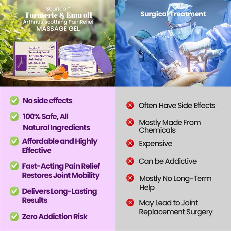Seurico™ Turmeric & Emu Oil Arthritis Soothing Pain Relief Massage Gel combines the potent anti-inflammatory properties of turmeric with the deep-penetrating benefits of emu oil. Turmeric contains curcumin, which inhibits inflammatory enzymes, reducing swelling, pain, and redness in affected joints. Emu oil works synergistically with turmeric to deeply nourish tissues, cartilage, and bones, promoting faster healing and reducing inflammation.